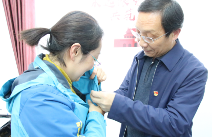 (何桂昌同志为广信党员佩戴党徽)