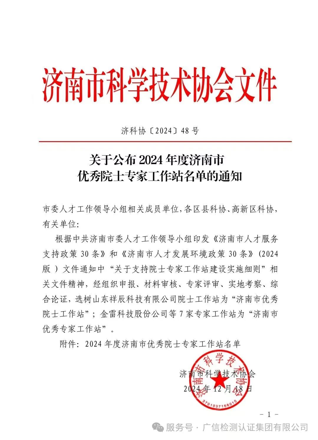12月20日,济南市科学技术协会公布《关于公布2024年度济南市优秀院士专家工作站名单的通知》, 乐鱼网站被评为2024年度“济南市优秀专家工作站”。