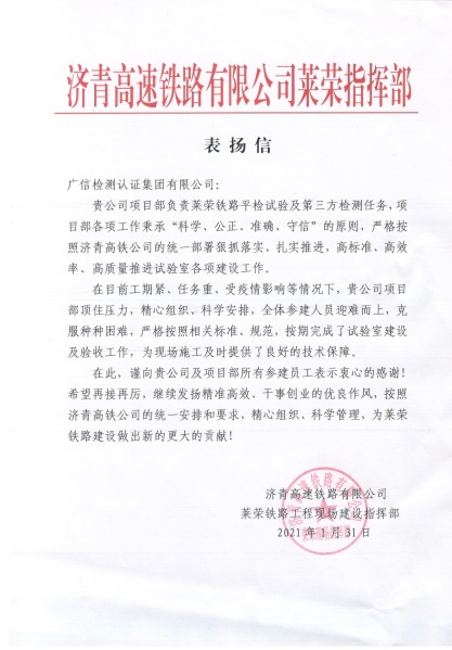 试验室一定会严格按照“科学、公正、准确、守信”的质量方针和济青高速铁路有限公司管理制度以及招标文件要求,高标准、高质量、高效率地完成第三方乐鱼网站和平检工作,严格履行“业主放心、监理信任、客户满意”的服务承诺。绝不辜负各位领导对我们的信任和期望。